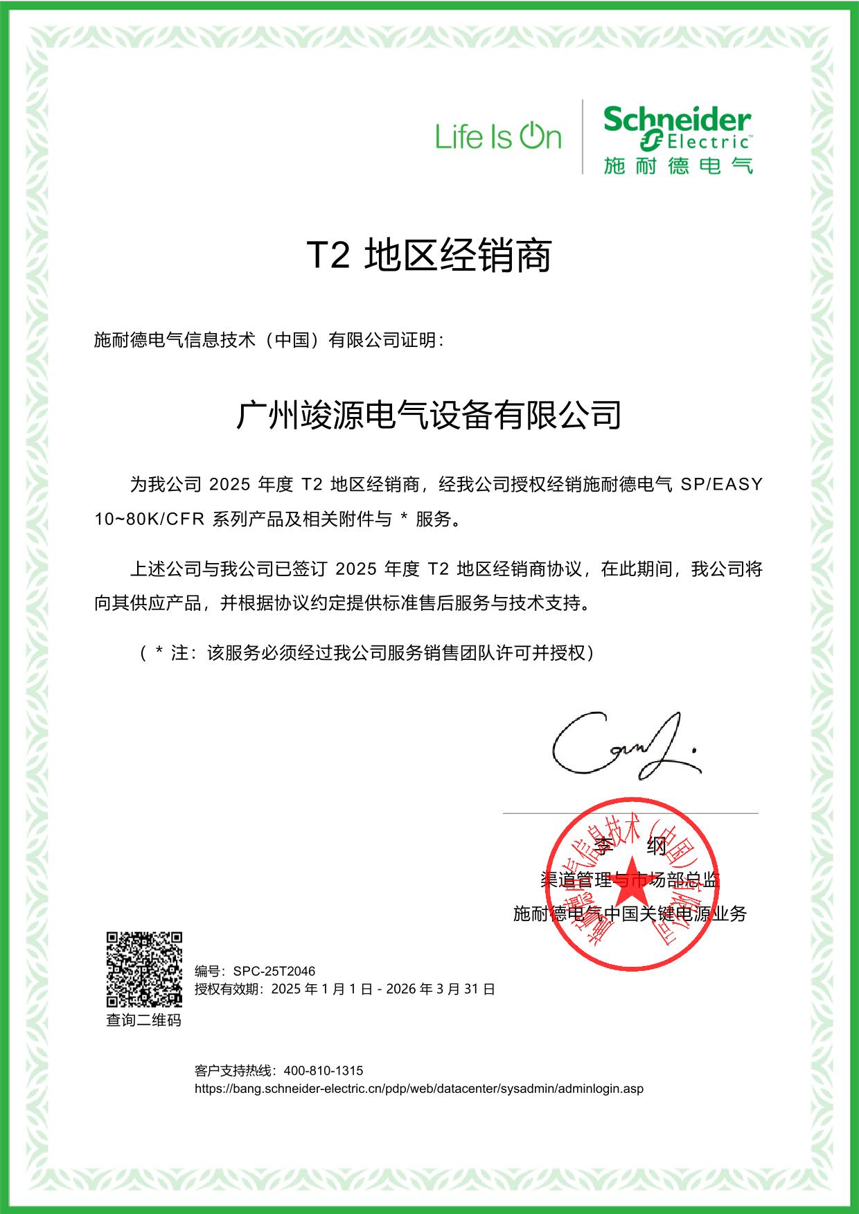 施耐德授權(quán)代理證